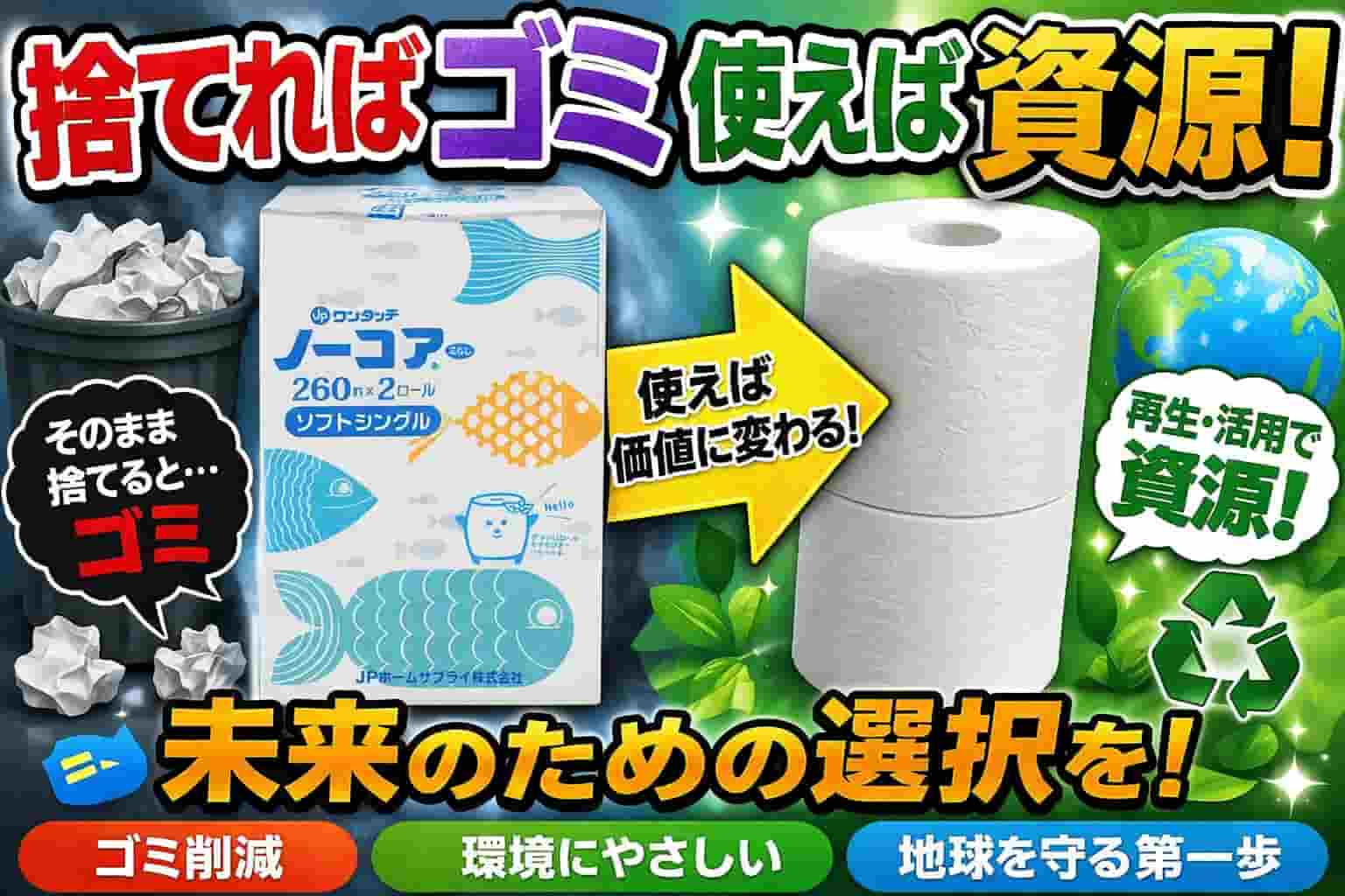 捨てればゴミ使えば資源JPワンタッチノーコアは、トイレットペーパーの包み紙を水切りゴミ袋として再利用できる画期的な商品です。